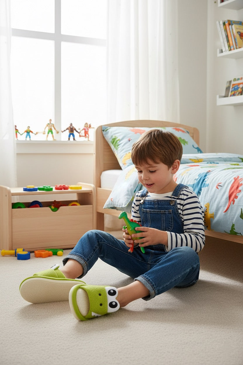 Chaussons enfant garçon Vert dinosaure | Confortables & Antidérapants